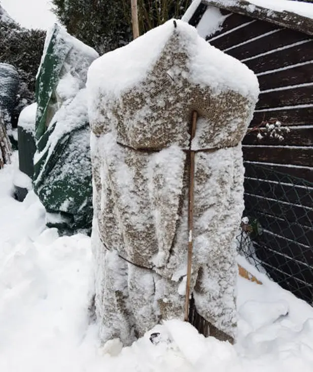 Een laagje droge sneeuw werkt juist isolerend. Haal de sneeuw alleen weg als takken dreigen te breken.